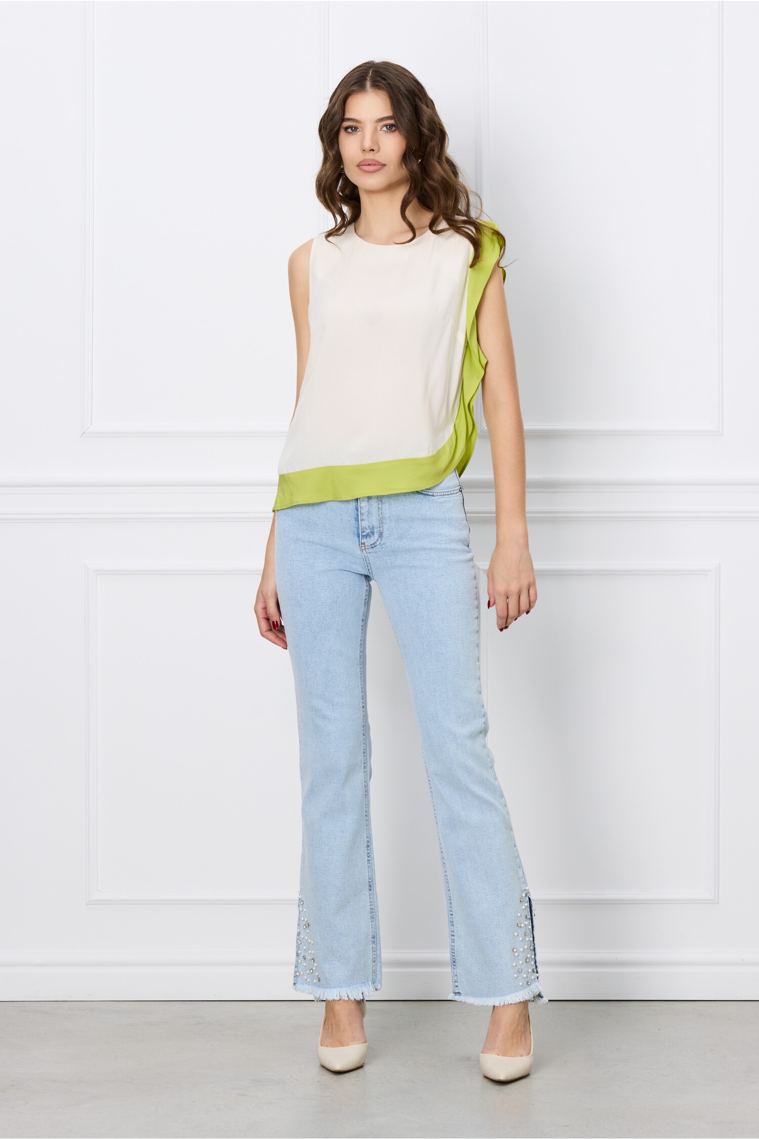 Specification: Blugi Aria albastri cu perle si decupaj la baza