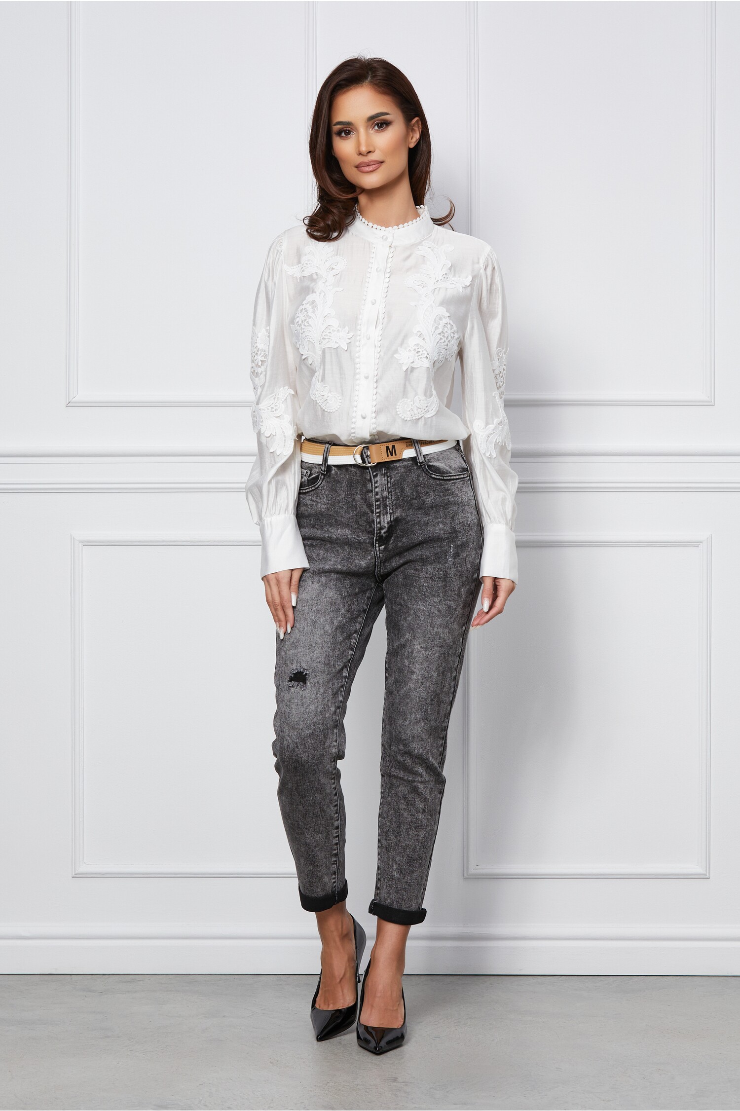 Specification: Blugi Daria gri mom fit cu talie inalta si curea in talie