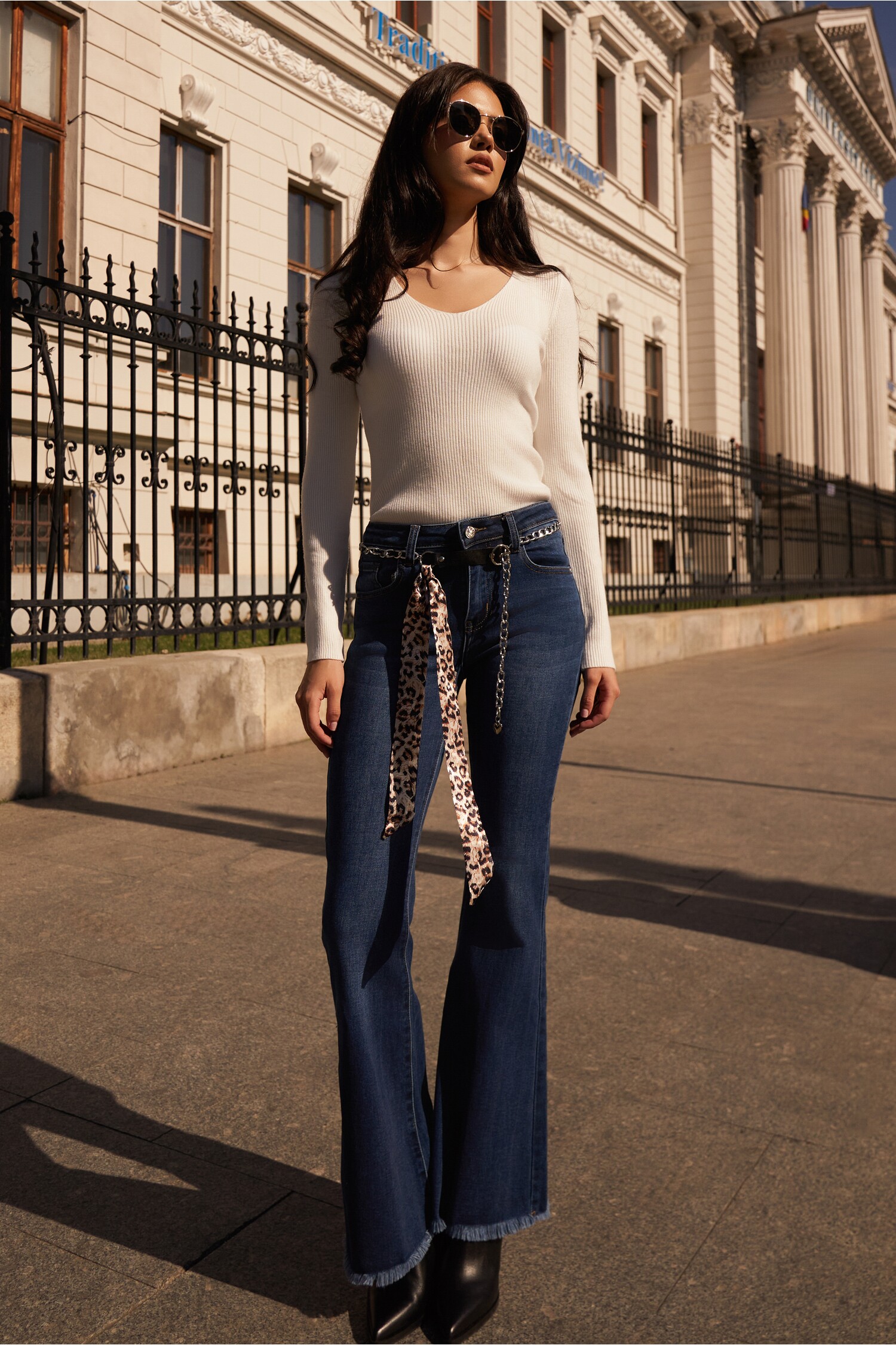 Blugi June albastru inchis evazati cu accesoriu tip lant si esarfa! La acest produs ai transport si retur/schimb gratuite! Livrare in Easy Box!