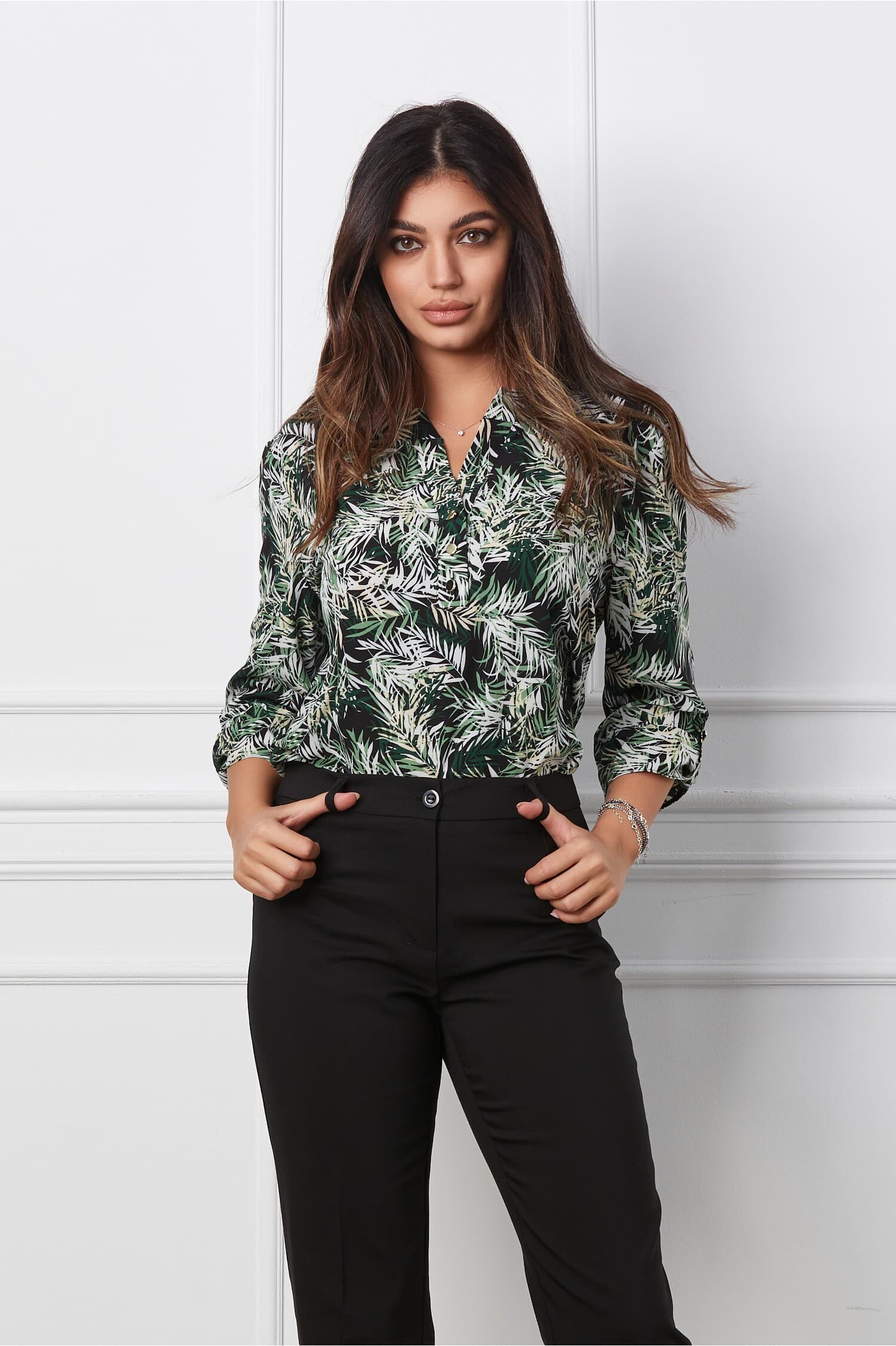 Bluza Caterina neagra cu imprimeu verde si maneci prinse