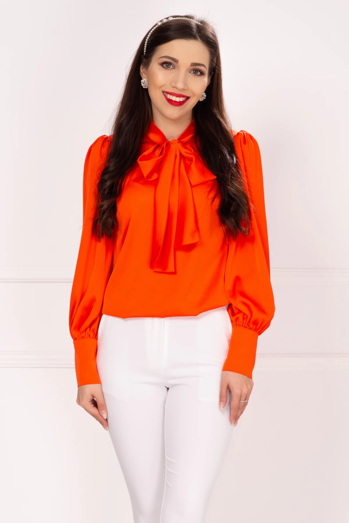 Bluza dama orange din satin cu funda stilizata! Cost curierat oriunde in ROMANIA? -15 lei! Livrare in EASYBOX – 10 lei! Livram in UE.