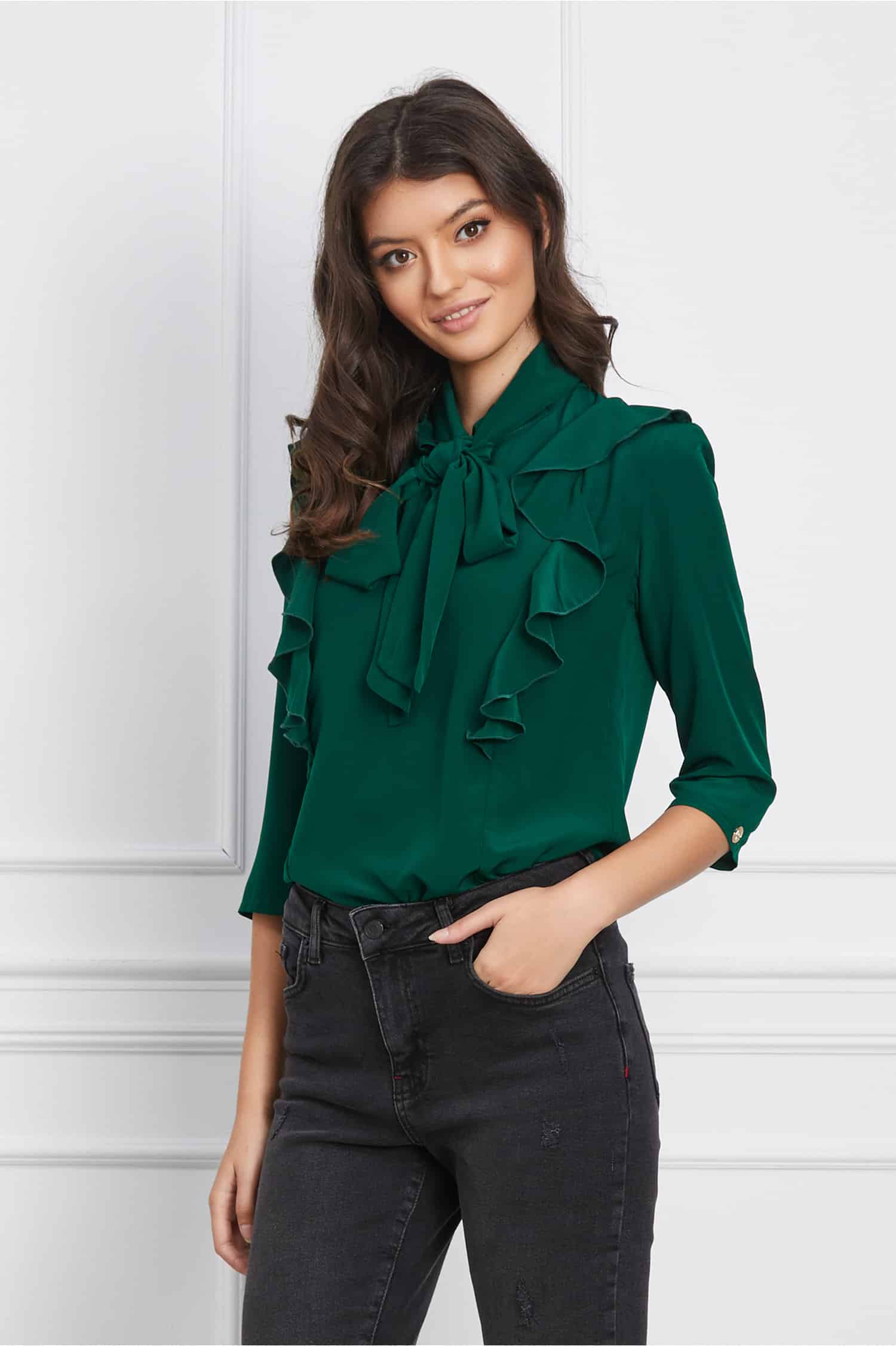 Bluza Dy Fashion verde cu volanase pe bust si funda la guler