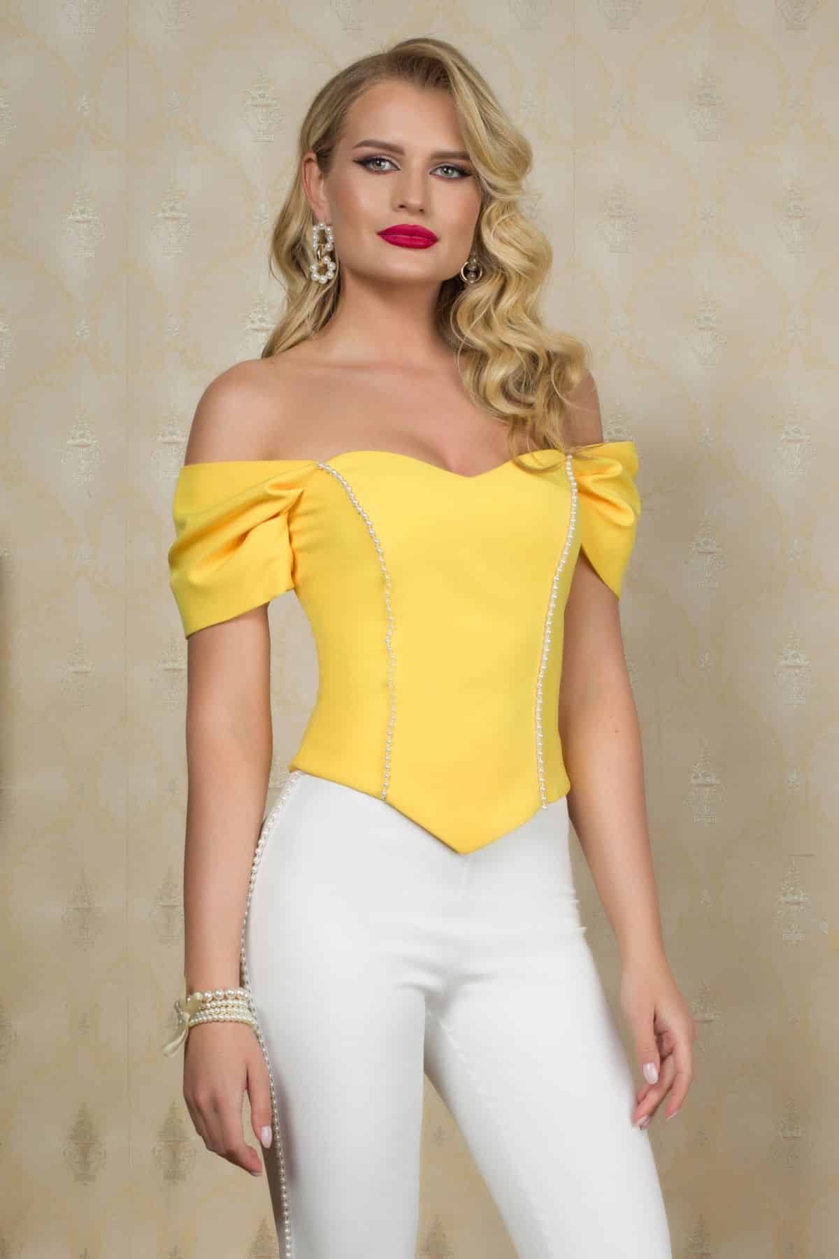 Bluza eleganta Pretty Girl galbena tip corset cu banda din perle! Cost curierat oriunde in ROMANIA -15 lei! Livrare in EASYBOX – 10 lei! Livram in UE.