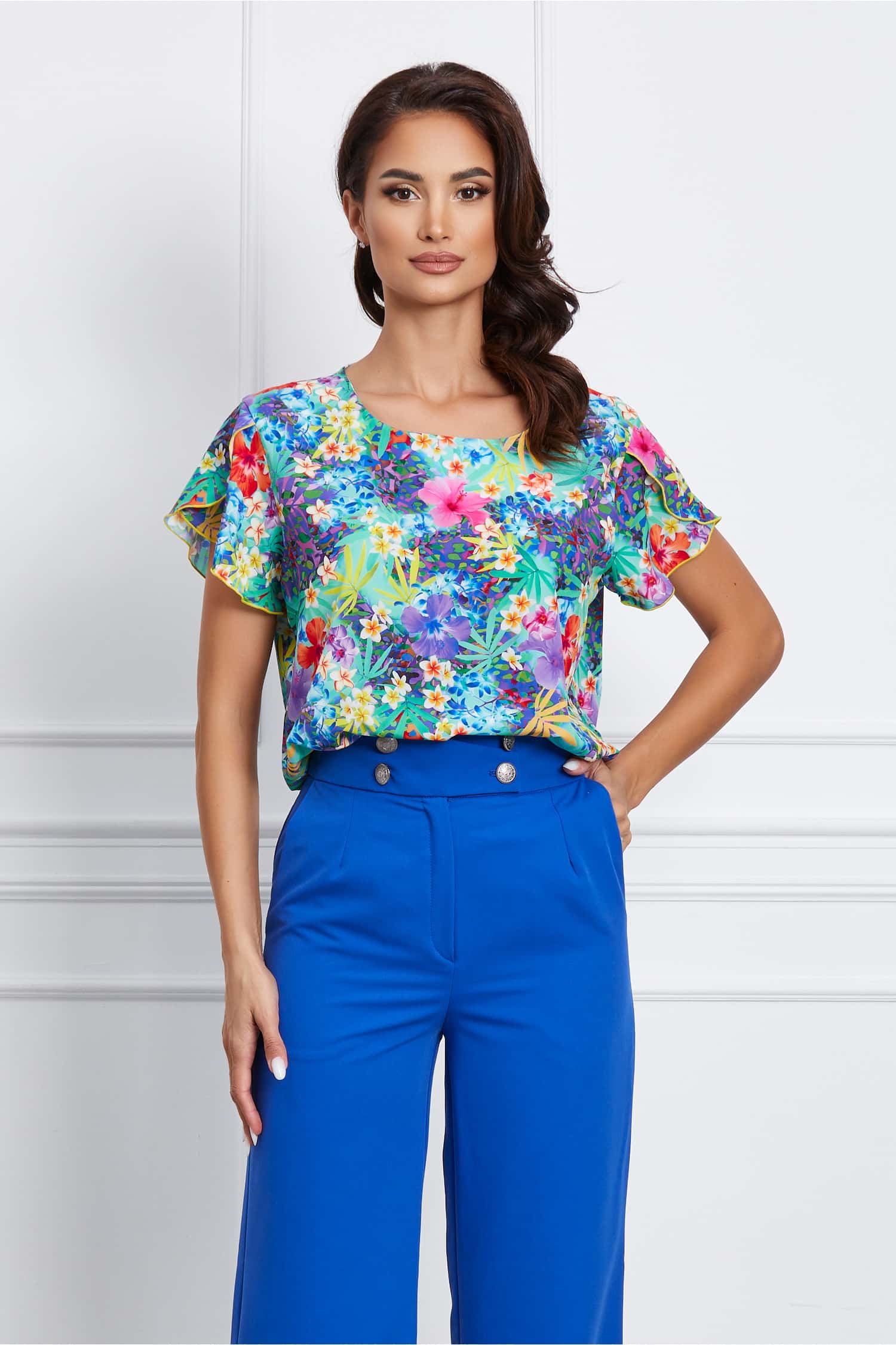 Bluza Frona este vaporoasa, are decolteu rotund, maneci scurte despicate si croi lejer. bluza lejera decolteu rotund maneci scurte croi lejer necaptusita Material: voal Compozitie: 95% poliester, 5% elastan Instructiuni de intretinere:Â Â Â Â Â *Va rugam verificati eticheta produsului inainte de curatare! *Pozitia tiparului imprimeului poate fi diferita datorita taierii. *Modelul are inaltimea de 174 cm. *Va rugam sa retineti ca o usoara discrepanta de culoare ar trebui sa fie acceptabila datorita luminii si luminozitatii ecranului. Â *Va rugam verificati ghidul de marimi, in cm, pentru a alege corect marimea. Â