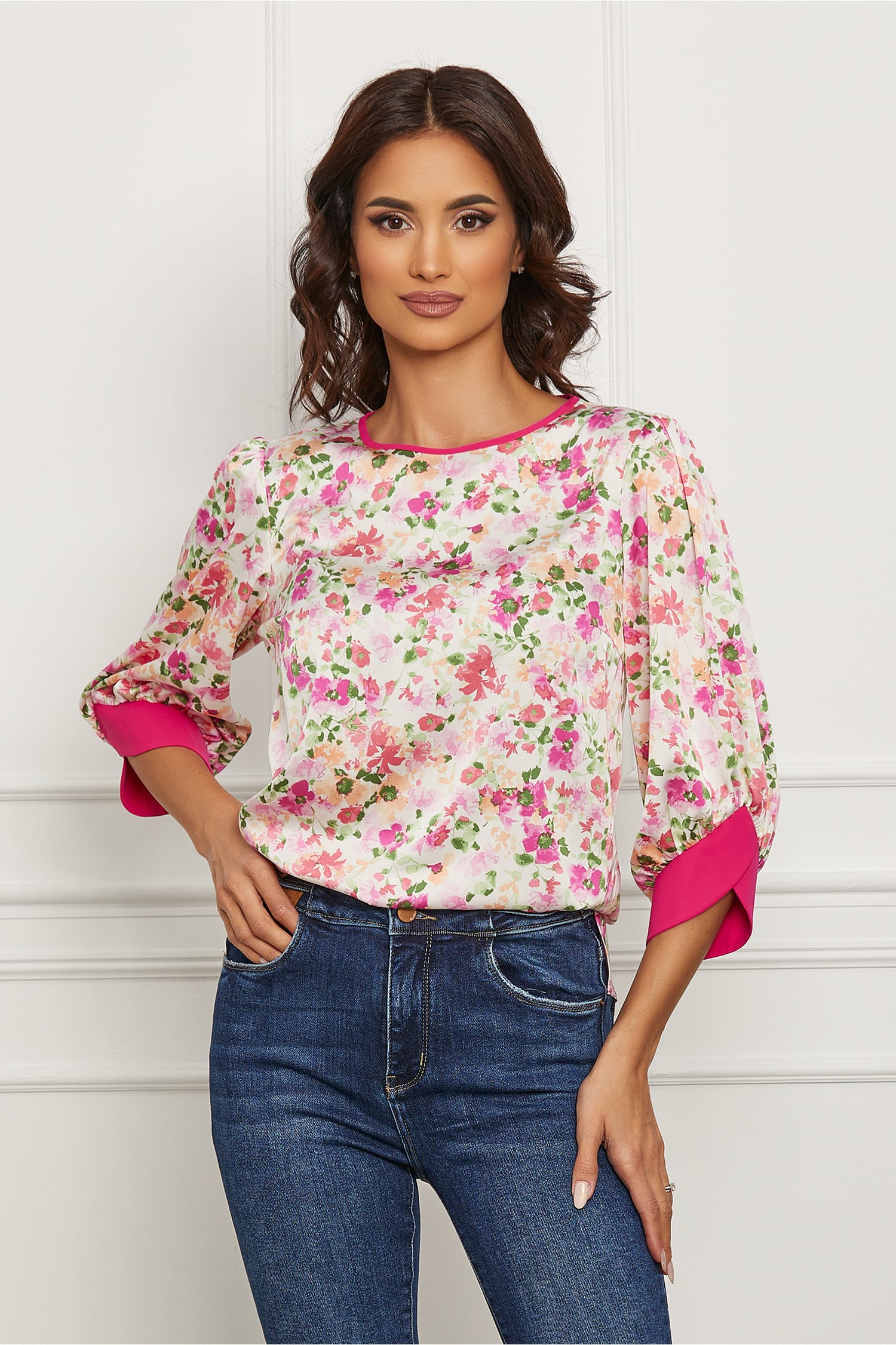 Specification: Bluza LaDonna alba cu imprimeuri florale fucsia