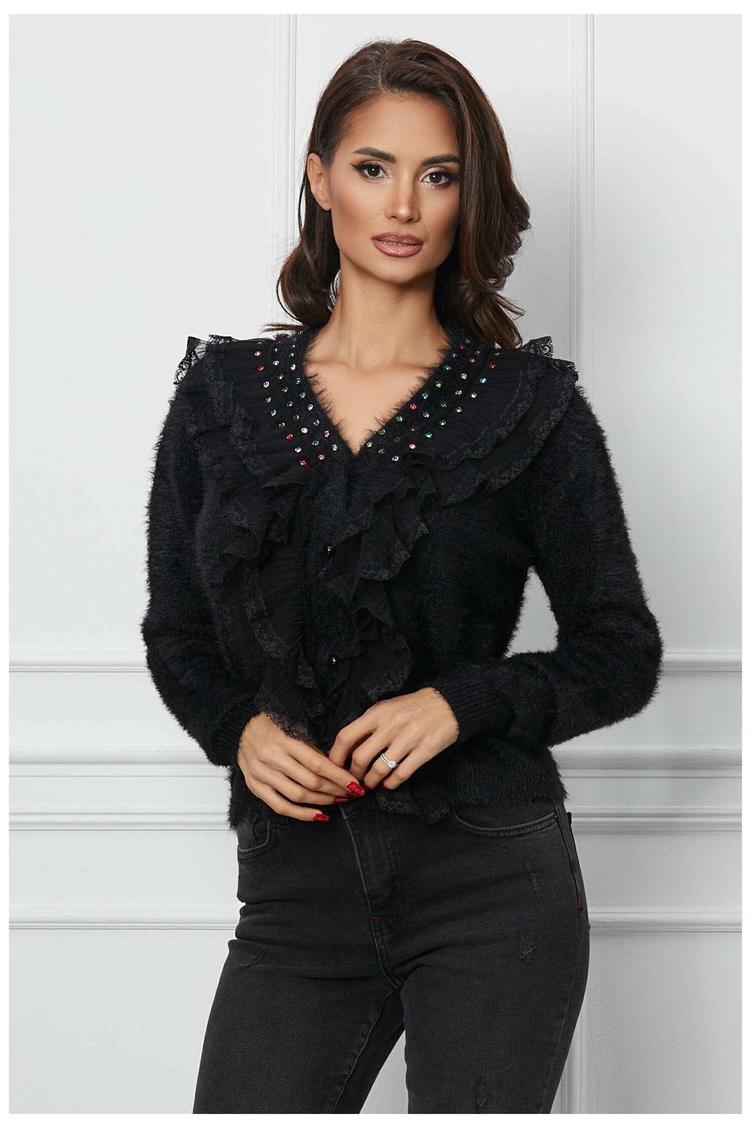 Specification: Bluza Mirela neagra cu strasuri si volanase