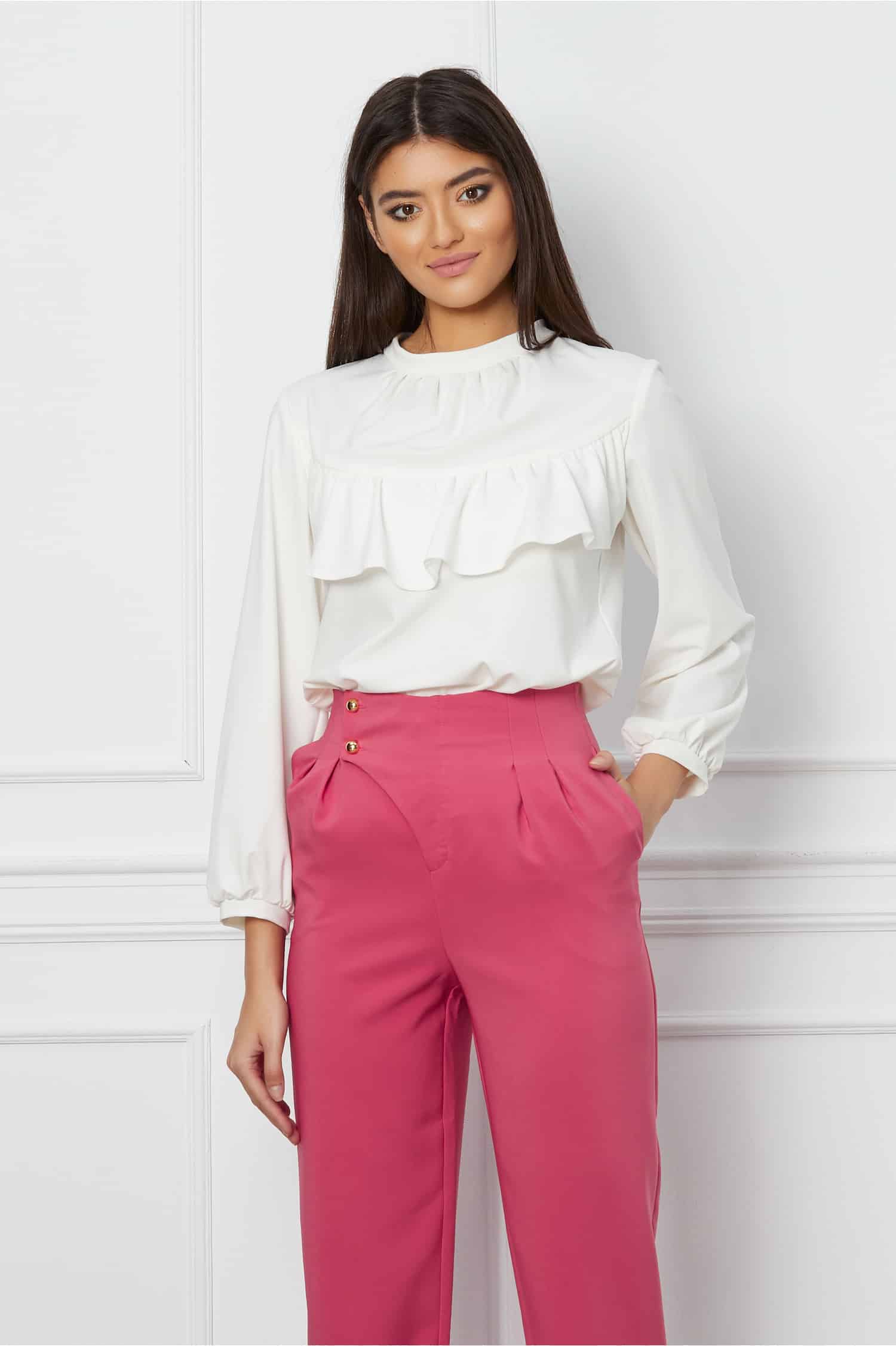 Specification: Bluza Moze alba cu volan pe bust