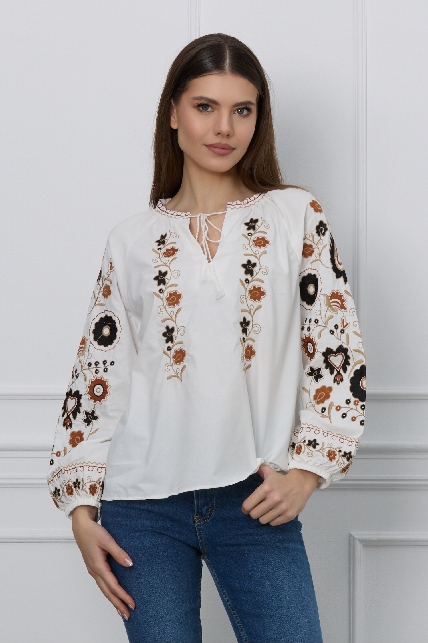 Specification: Bluza Simina alba cu broderie florala maro cu negru