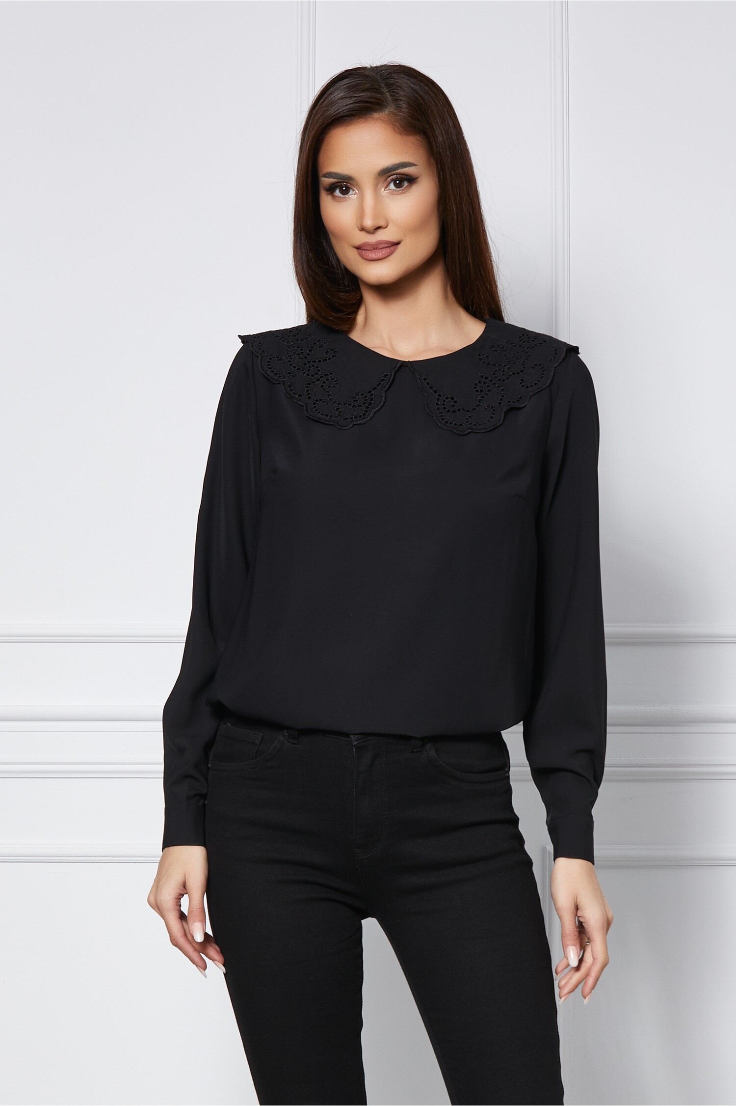 Specification: Bluza Teodora neagra cu guler din ghipura