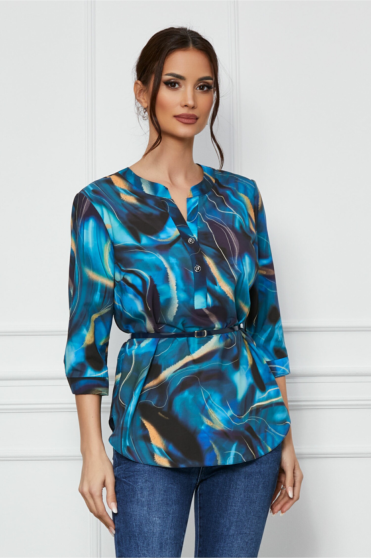 Specification: Bluza Vanessa turcoaz cu imprimeu galben si curea in talie