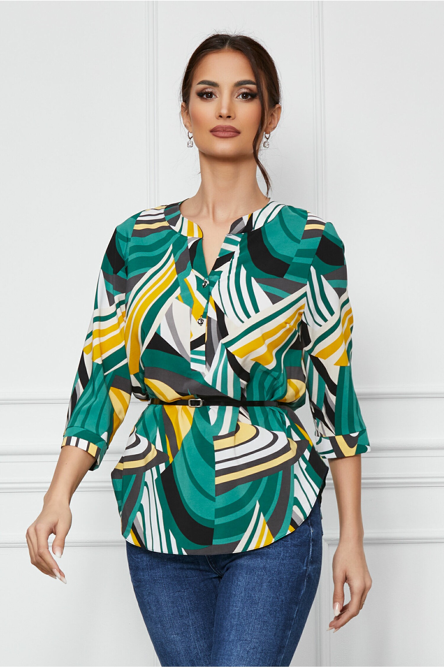 Specification: Bluza Vanessa verde cu imprimeu galben si curea in talie