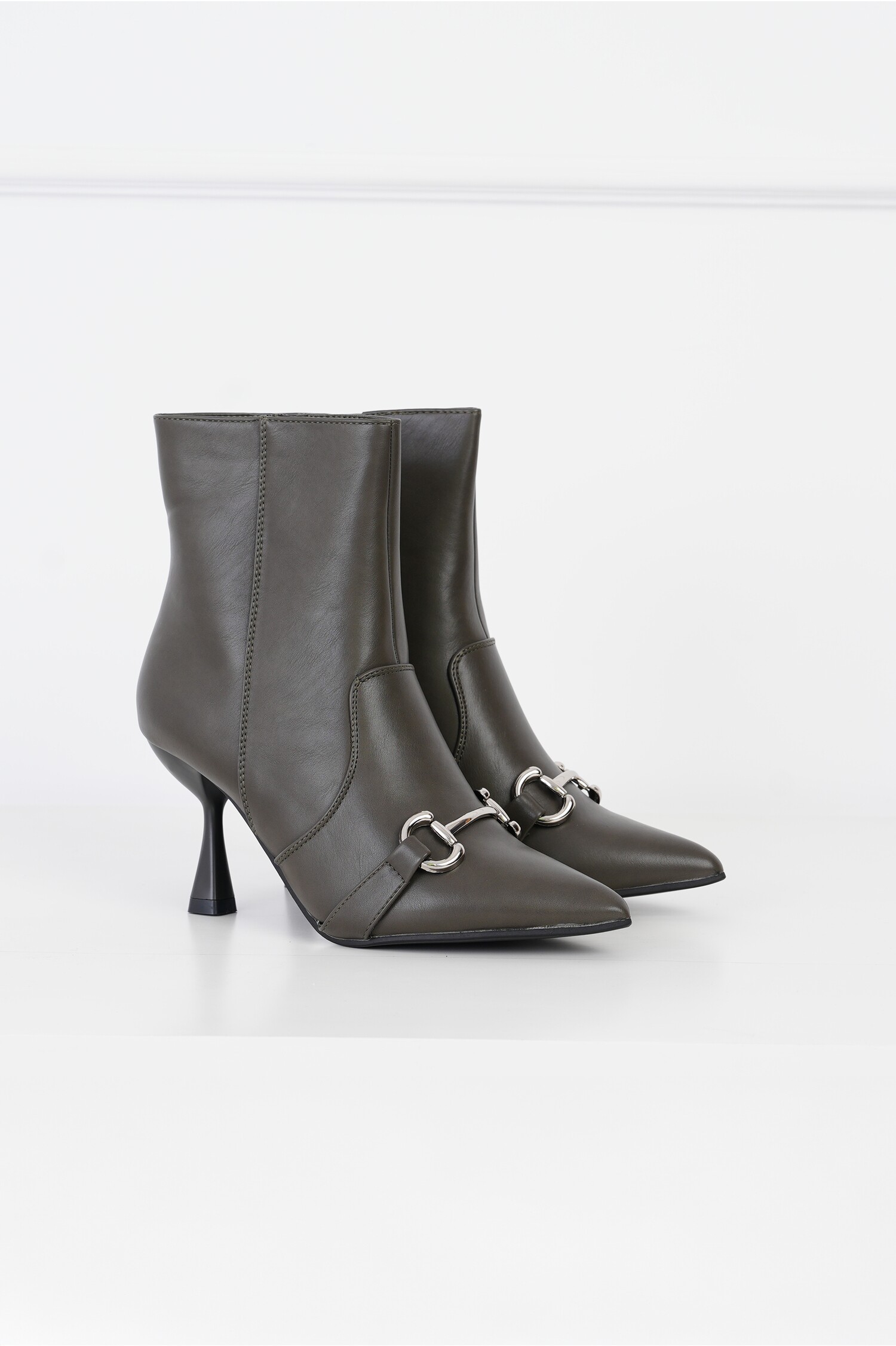 Botine din piele ecologica kaki cu aplicatie metalica pe varf