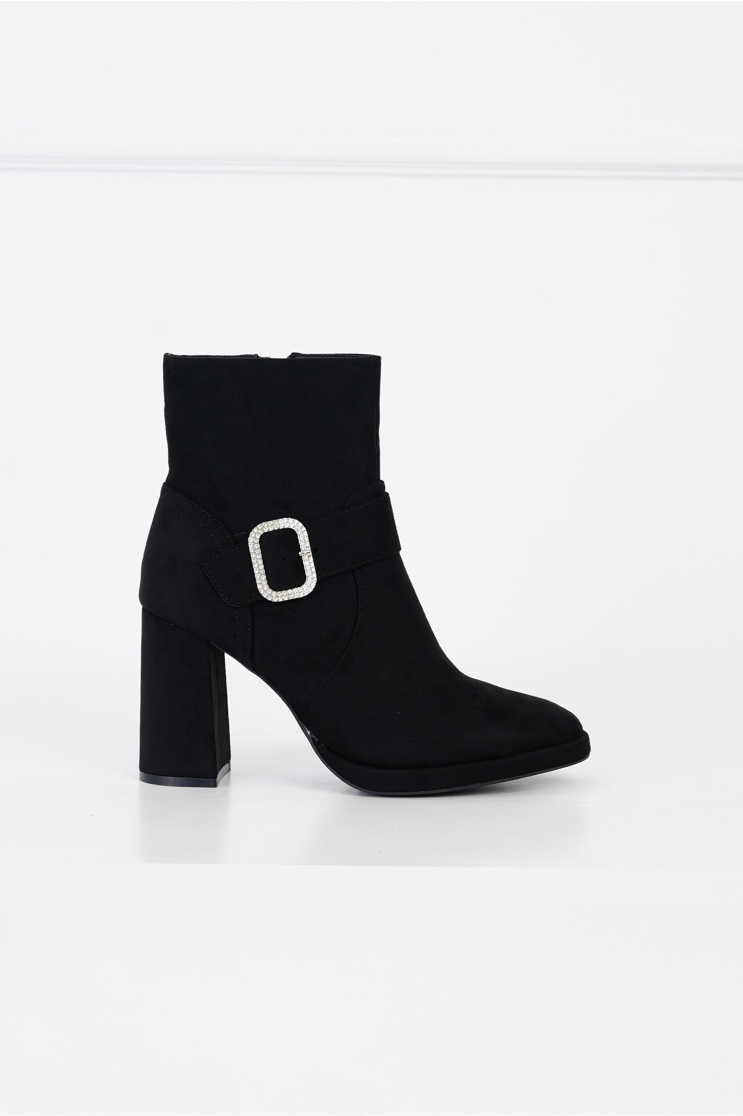 Botine elegante din piele intoarsa ecologica cu catarama stralucitoare. Au varful rotund, toc gros inalt si inchide cu fermoar. Botine elegante  Varf rotund Toc gros Inchidere cu fermoar Material: Piele ecologica intoarsa Inaltime toc: 10 cm *Va rugam verificati eticheta produsului inainte de curatare! *Va rugam sa retineti ca o usoara discrepanta de culoare ar trebui sa fie acceptabila datorita luminii si luminozitatii ecranului.   *Va rugam verificati ghidul de marimi, in cm, pentru a alege corect marimea.