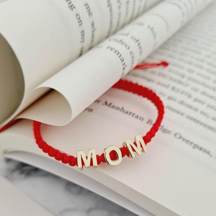 Specification: Bratara 3 litere – MOM – Aur Galben 14K – Snur rosu impletit dama