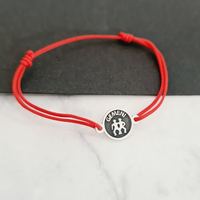 Nativii zodiei Gemeni sunt considerati persoane foarte inteligente cu excelente abilitati de comunicare. Bratara este din argint 925, productie 100% romaneasca. Snurul rosu din matase vegetala este reglabil. De multe ori, aceste bratari sunt purtate si pentru deochi. Diametrul banutului este de 7 mm, iar pe verso este inscriptionata caracteristica specifica acestei zodii: INTELIGENT.