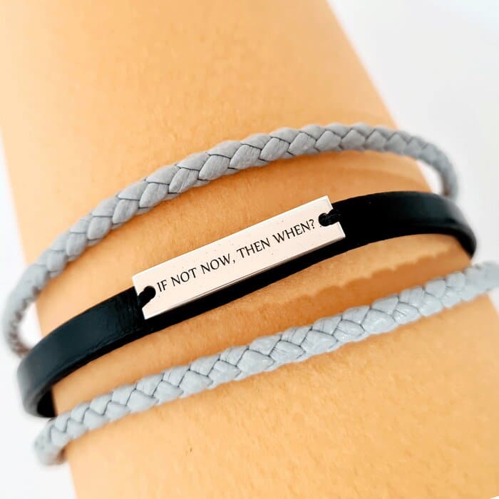 Alege un cadou perfect pentru un tata, prieten, iubit sau sot. Bratara este realizata cu 3 straturi de piele naturala: 2 laterale impletite de culoare gri si una in mijloc simpla neagra pe care este cusuta o placuta personalizata cu un nume sau un mesaj semnificativ. Inchizatoarea din otel inoxidabil aduce tot aspectul bratarii impreuna.  DESPRE PRODUS: Bratara este creata pe marimi, prin urmare te rugam sa ne spui in casuta Marime bratara care este circumferinta incheieturii in cm. Bratara este creata din 3 straturi de piele naturala, iar pe cea din mijloc este cusuta o placuta din Argint 925 de 5×325 mm Sistemul de inchidere a bratarii este cu inchizatoare tip clips din otel inoxidabil. Pe placuta puteti alege sa gravati un mesaj special. Daca nu stii care e marimea ta sau a persoanei careia doresti sa ii faci cadou bratara, articolul Cum sa masori dimensiunea incheieturii? de pe blogul Chic Bijoux iti vine in ajutor. Gramaj aproximativ ARGINT 925:1.1 grame Aceasta bijuterie personalizata este realizata de la zero pentru fiecare comanda in parte. Dupa plasarea si confirmarea comenzii incepe procesul ei de creatie:  Realizare Design -> Taiere/Personalizare -> Finisare manuala -> Polish Final -> Ambalare -> Livrare! Datorita procesului de productie si a personalizarii bijuteriei dupa propria dorinta gramajul final al produsului poate fi diferit. Din acest motiv pe site este afisat gramajul obtinut prin catarirea produsului realizat in pozele de prezentare. Pretul produsului include pe langa costul gramului de Argint 925 si tot procesul de mai sus, necesar pentru realizarea unui produs cu adevarat special pentru tine.   Toate produsele din Argint 925 comercializate de Chic Bijoux sunt marcate cu titlul Argintului· 925 ·  RECOMANDARI: Nu scufundati bratara in lichide sau substante de curatare: pielea se poate decolora sau decoji, iar bijuteriile placate se deterioriaza si isi pot chiar schimba culoarea. Contactul zilnic cu apa (bai) sau cu produse chimice (spray-uri, detergenti, inalbitor, clor, diluanti etc.) pot de asemena sa afecteze bijuteria, existand riscul de a se desface si/sau de a se decolora. Pentru ca bratara sa se potriveasca te rugam sa ne transmiti marimea.  Dupa plasarea comenzii veti fi contactat de o colega din echipa Chic Bijoux pentru toate detaliile necesare personalizarii produsului. Bijuteria va ajunge la tine intr-un saculet elegant din catifea, impreuna cu certificatul de calitate ce atesta autenticitatea materialelor folosite