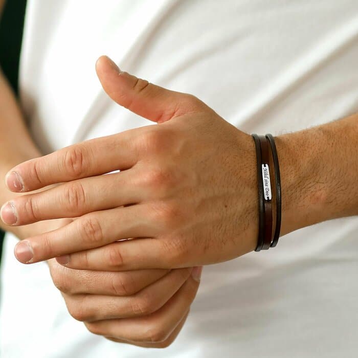 Specification: Bratara barbateasca cu 3 straturi de piele naturala simpla – Placuta ingusta cu gravura personalizata – Argint 925 – Inchizatoare clips inox