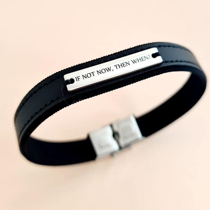 Bratara barbateasca cu piele eleganta neagra – Placuta cu text personalizat – Argint 925 – Inchizatoare clips inox
