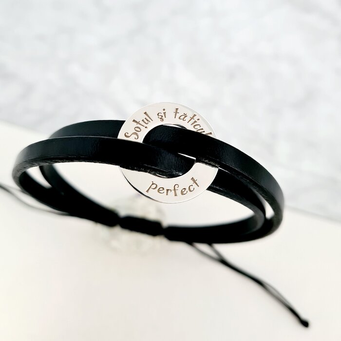 Arata-i unui prieten, sotului sau tatalui tau cat de mult inseamna pentru tine printr-o bratara special creata pentru el care sa ii reflecte personalitatea. DESPRE PRODUS: Pandantul sub forma de disc este creat din Argint 925 Bratara este reglabila prin intermediul unui snur din matase vegetala prins la capetele bandei de piele. Dimensiunea minima standard este de 20 cm, insa aceasta poate fi modificata la cerere -> Spune-ne in casuta Marime bratara care este circumferinta incheieturii. Pe pandant puteti alege sa gravati oricare mesaj special. Daca nu stii care e marimea ta sau a persoanei careia doresti sa ii faci cadou bratara, articolul Cum sa masori dimensiunea incheieturii?  de pe blogul Chic Bijoux iti vine in ajutor.  Gramaj aproximativ ARGINT 925: 1.75 grame Aceasta bijuterie personalizata este realizata de la zero pentru fiecare comanda in parte. Dupa plasarea si confirmarea comenzii incepe procesul ei de creatie:  Realizare Design -> Taiere/Personalizare -> Finisare manuala -> Polish Final -> Ambalare -> Livrare! Datorita procesului de productie si a personalizarii bijuteriei dupa propria dorinta gramajul final al produsului poate fi diferit. Din acest motiv pe site este afisat gramajul obtinut prin catarirea produsului realizat in pozele de prezentare. Pretul produsului include pe langa costul gramului de Argint 925 si tot procesul de mai sus, necesar pentru realizarea unui produs cu adevarat special pentru tine.  Toate produsele din Argint 925 comercializate de Chic Bijoux sunt marcate cu titlul Argintului· 925 ·  RECOMANDARI: Nu scufundati bratara in lichide sau substante de curatare: pielea se poate decolora sau decoji, iar bijuteriile placate se deterioriaza si isi pot chiar schimba culoarea. Contactul zilnic cu apa (bai) sau cu produse chimice (spray-uri, detergenti, inalbitor, clor, diluanti etc.) pot de asemena sa afecteze bijuteria, existand riscul de a se desface si/sau de a se decolora. Pentru ca bratara sa vi se potriveasca te rugam sa ne transmiti marimea.  Dupa plasarea comenzii va va contacta o colega din echipa Chic Bijoux pentru toate detaliile necesare personalizarii produsului.
