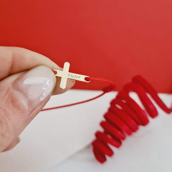 Specification: Bratara Cruciulita de 15 mm – Nume gravat – Aur Galben 9K – Snur reglabil de diverse culori