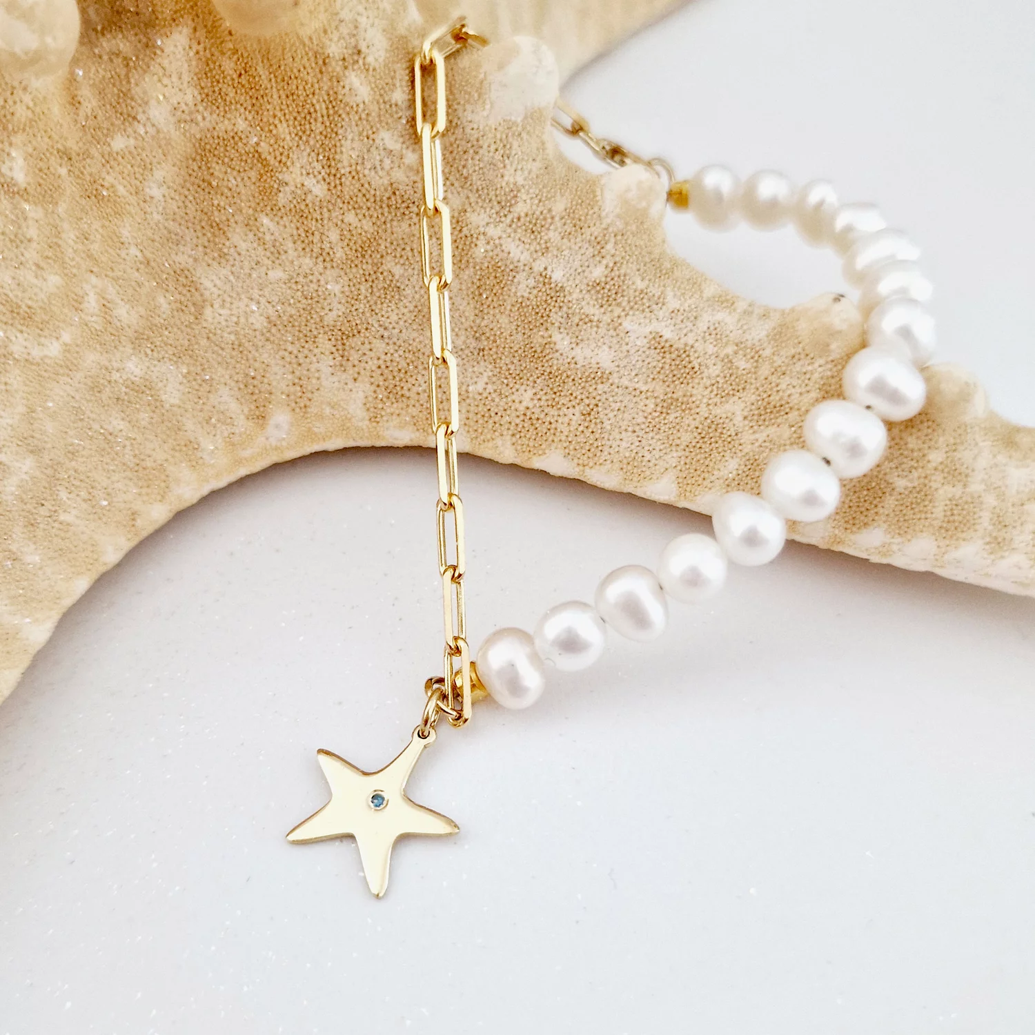 Bratara cu Perle si Diamant natural – Stella Marina – Model combinat cu perle si lantisor zale – Argint 925 placat cu Aur Galben 18K