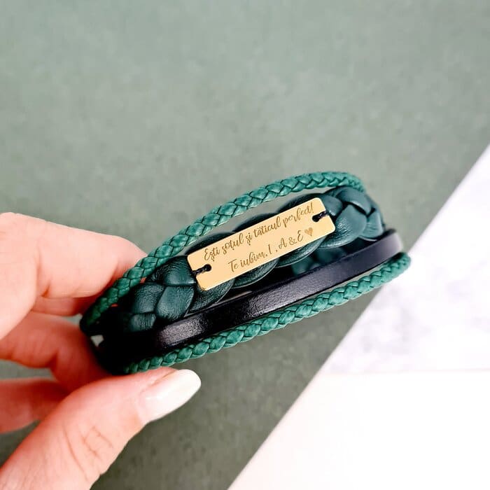 Specification: Bratara Fresh – Model barbatesc cu piele verde – Placuta cu gravura personalizata din Argint 925 placat cu Aur Galben 18K – Inchizatoare neagra inox