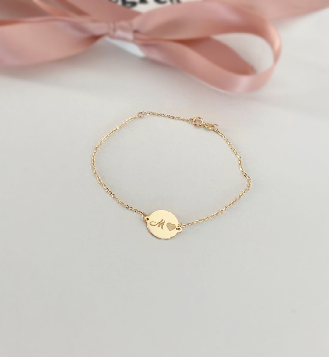Bratara cu banut de 12 mm ce poate fi gravat cu numele sau data de nastere a persoanei dragi, este o alegere inspirata de cadou unic, personalizat! Surprinde placut si ofera o bijuterie personalizata si plina de gingasie, cu gravura fata-verso, potrivita atat pentru o domnisoara cat si pentru o doamna! <3Specificatii bijuterie: Material: aur galben 14K;Dimensiune banut: 12 mm;Dimensiune bratara: 18 cm cu veriga intermediara si la 16 cm;Intrucat se realizeaza pe baza de comanda, bratara se poate confectiona atat din aur galben cat si alb sau roze de 14K. Primiti bratara in cutie tip cadou, certificat de calitate si factura fiscala.Bijuteria se realizeaza pe comanda, special realizata pentru dumneavoastra, intrucat nu detinem stocuri.Dupa plasarea comenzii veti fi contactat de un consultant pentru stabilirea detaliilor necesare realizarii si livrarii bijuteriei. Daca alegeti varianta aurului alb sau roze 14K, va informam ca toate componentele bijuteriei sunt din aur galben 14K galvanizate cu nuanta aleasa respectiv alb sau roze. Daca doriti din material dedicat respectiv aur alb sau roze 14k va rugam sa transmiteti consultantului la confirmarea comenzii si veti primi oferta de pret.