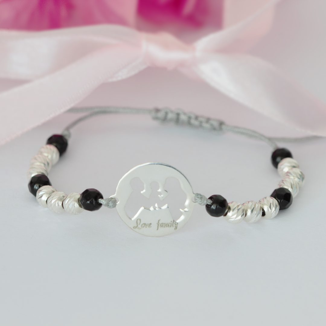 Bratarile cu bilute sunt elegante, se asorteaza usor la orice tinuta si? ?poarta? cu ele diverse semnificatii spirituale.Alege o bratara ce ilustreaza integritatea familiei, compusa din mama, tata si copil si ofera un dar pretios sufletului!?Bilutele onix sunt pietre semipretioase elegante, negre care in combinatie cu bilutele fatetate din argint aduc un plus de stralucire outfit-ului.Specificatii bijuterie: Dimensiune pandantiv din argint: 14 mm;Bilute onix fatetate de 4 mm;?Bilute fatetate argint 925 de 4 mm;Bratara snur cu noduri, marime reglabila.Pandantivul se poate grava cu un nume sau o combinatie de doua cuvinte, gratuit; Primiti bratara in ambalaj elegant, certificat de calitate si factura fiscala.Bijuteriile sunt confectionate? pe baza de? comanda, special realizate pentru dumneavoastra, intrucat nu detinem stocuri.Dupa plasarea comenzii veti fi contactat de un consultant pentru stabilirea detaliilor necesare realizarii si livrarii bijuteriei.