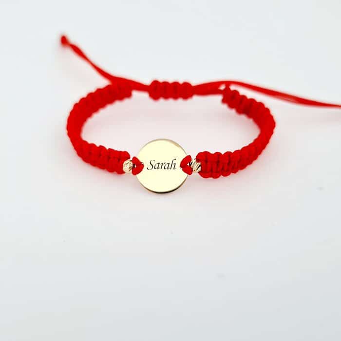 Bratara personalizata – Banut 10 mm gravat cu nume/data/initiala si cu 2 bilute 3 mm – Aur Galben 14K – Snur impletit reglabil