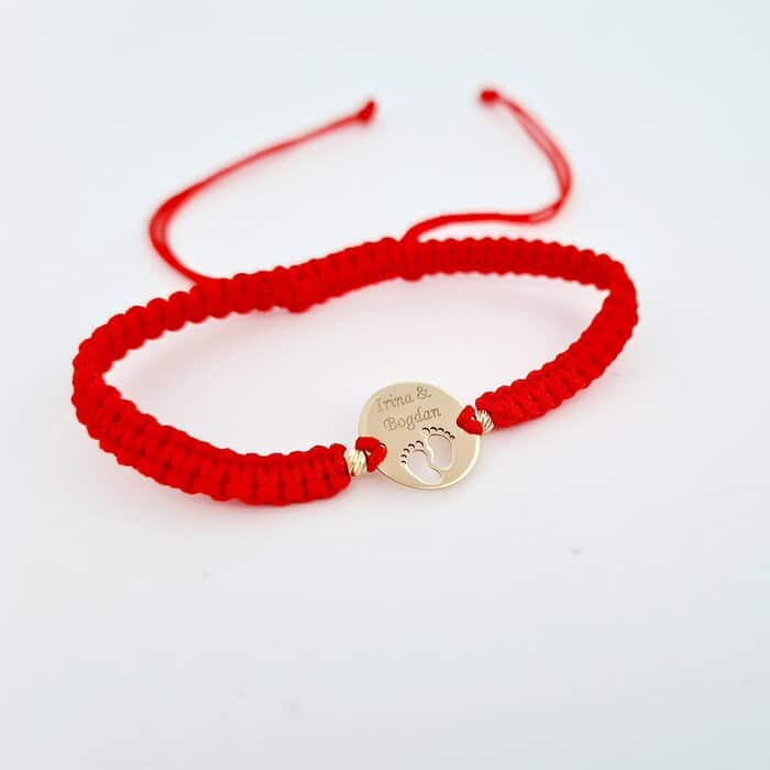 Un copil va umple un gol in inima ta si iti va inconjura viata de iubire si clipe frumoase.   DESPRE PRODUS: Banutul este creat din Aur Galben de 14K si are d iametrul de 12 mm. Alaturi de banut sunt atasate 2 bilute de Aur Galben 14K de 3 mm fiecare.  Bratara este impletita si creata dintr-un snur din matase vegetala. Pentru o potrivire cat mai perfecta a bratarii te rugam sa ne transmiti dimesniunea in casuta specifica. Poti alege sa gravezi o data, un nume sau initiala pe banut. Bijuteria va ajunge la tine intr-un saculet elegant din catifea, impreuna cu certificatul de calitate ce atesta autenticitatea materialelor folosite. Gramaj aproximativ AUR 585:0.5 grame Aceasta bijuterie personalizata este realizata de la zero pentru fiecare comanda in parte.  Dupa plasarea si confirmarea comenzii incepe procesul ei de creatie:   Realizare Design -> Taiere/Personalizare -> Finisare manuala -> Polish Final -> Ambalare -> Livrare! Datorita procesului de productie si a personalizarii bijuteriei dupa propria dorinta gramajul final al produsului poate fi diferit. Din acest motiv pe site este afisat gramajul obtinut prin catarirea produsului realizat in pozele de prezentare.   Pretul produsului include pe langa costul gramului de Aur 585 si tot procesul de mai sus, necesar pentru realizarea unui produs cu adevarat special pentru tine   Dupa plasarea comenzii veti fi contactat de o colega din echipa Chic Bijoux pentru toate detaliile necesare personalizarii produsului. Toate produsele din Aur comercializate de Chic Bijoux sunt marcate cu titlul Aurului de 14K · 585 ·