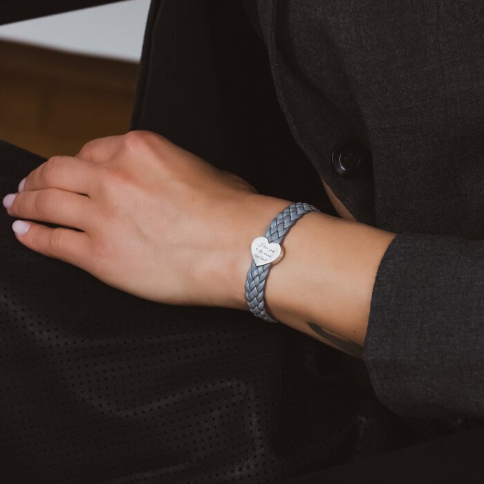 Specification: Bratara personalizata cu Charm 3D Inima – Argint 925 cu aspect mat – Piele impletita gri deschis – Inchizatoare clips din otel inoxidabil