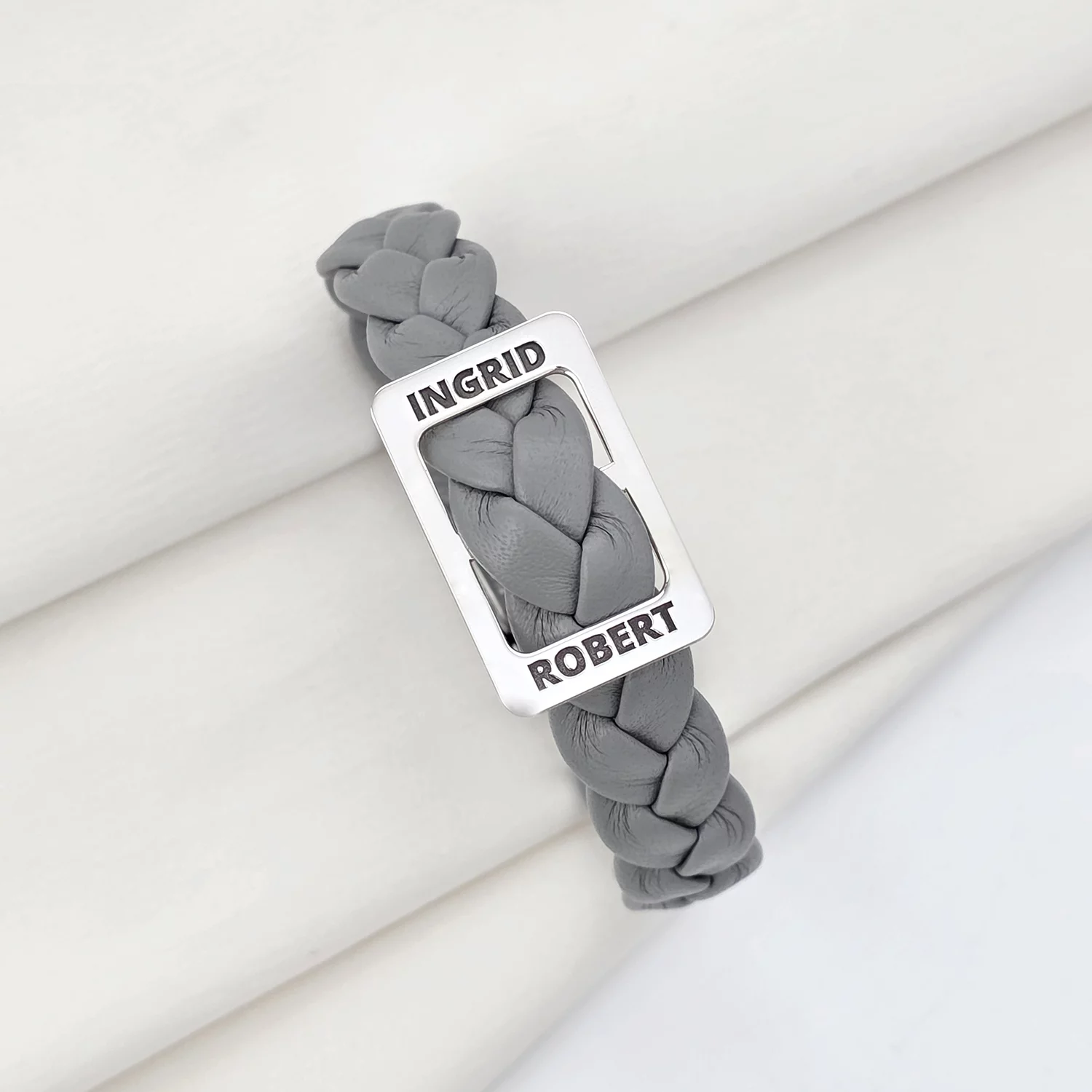 Specification: Bratara personalizata cu Charm placuta si nume gravate – Piele impletita gri – Argint 925 – Inchizatoare clips din otel inoxidabil