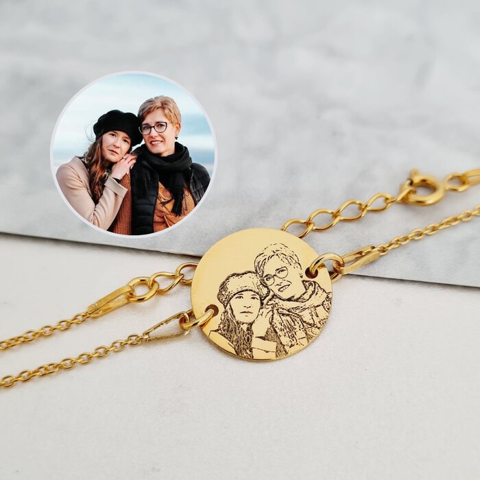 Graveaza fotografia cuiva special direct pe bijuteria aleasa si bucura-te de faptul ca te va insoti mereu. Bijuteria cu fotogravura creaza o reproducere in miniatura a fotografiei tale. Detaliile sunt incredibile si vei fi uimit(a) de liniile fine si de claritatea gravurii. Bratara este cu siguranta un cadou special ce va aduce zambetul pe buzele purtatorului! DESPRE PRODUS: Bijuteria este creata din Argint 925 placat cu Aur Galben 18K. Diametrul banutului este de 15 mm si este atasat de un lantisor de 15 cm cu o prelungire de 5 cm. Banutul poate fi gravat cu o poza personala cu tine, cu cineva drag sau cu animalul iubit. Pe verso bijutera poate fi gravata gratuit cu un mesaj special. Bijuteria este livrata in cutie premium Chic Bijoux alaturi de ambalaj cadou gratuit, fiind gata de a fi daruita. IMPORTANT PENTRU POZA TRIMISA: Pentru a putea transforma fotografia intr-o gravura unica incarca o imaginea cat mai clara direct in comanda la optiunea Poza personala . Fotografiile trimise/uploadate pot fi in format .jpeg sau .png cu o rezolutie inalta (o rezolutie de 1000 pixeli sau mai mare). Nu trimiteti poza decupata sau scanata, utilizati o fotografie din propria galerie. Chipurile din cadrul imaginii sa fie centrate, sa nu lipseasca bucati precum ureche, frunte, par etc. NU recomandam poze de tip selfie, tip buletin. De asemenea, poza trimisa sa aiba o luminiozitate cat mai mare . Putem grava aproape orice fotografie pe bijuterie: persoane dragi tie, animale de companie sau orice altceva dorești să ai aproape de tine zi de zi. Fotografia ar trebui sa fie o fotografie pe care ati facut-o sau aveti permisiunea de a o folosi pentru gravare. Responsabilitatea si raspunderea pentru incalcarea drepturilor de autor vor reveni cumparatorului. INFORMATII FOTOGRAVURA: Pentru o preluare cat mai calitativa va rugam sa furnizati imagini clare si de inalta calitate , cu cat imaginea este mai clara, cu atat efectul este mai bun. >>> Vezi POZA EXPLICATIVA aflata printre pozele produsului. In mod implicit, eliminam fundalul fotografiei tale . In gravura vor aparea doar figurile din prim-plan. Inainte de plasarea comenzii ia in considerare dimensiunea bijuteriei si elementele ce ti le doresti gravate din fotografie. In cazul in care iti doresti fotogravura cu mai multe persoane acestea trebuie sa fie incadrate cat mai apropiat in imagine. Va rugam sa retineti ca pentru o preluare cat mai fidela a detaliilor din fotografie pe bijuterie pot fi gravate pana la patru persoane apropiate ca si pozitie. Gramaj aproximativ ARGINT 925: 1,80 grame Aceasta bijuterie personalizata este realizata de la zero pentru fiecare comanda in parte. Dupa plasarea si confirmarea comenzii incepe procesul ei de creatie: Realizare Design -> Taiere/Personalizare -> Finisare manuala -> Polish Final -> Ambalare -> Livrare! Datorita procesului de productie si a personalizarii bijuteriei dupa propria dorinta gramajul final al produsului poate fi diferit. Din acest motiv pe site este afisat gramajul obtinut prin catarirea produsului realizat in pozele de prezentare. Pretul produsului include pe langa costul gramului de Argint 925 si tot procesul de mai sus, necesar pentru realizarea unui produs cu adevarat special pentru tine. Toate produsele din Argint 925 comercializate de Chic Bijoux sunt marcate cu titlul Argintului· 925 · Dupa plasarea comenzii veti fi contactat de o colega din echipa Chic Bijoux pentru toate detaliile necesare personalizarii produsului.