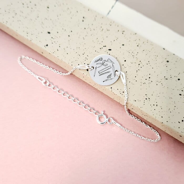 Specification: Bratara personalizata cu simbol materie scoala – Tehnologie – Banut de 15 mm cu lantisor – Argint 925