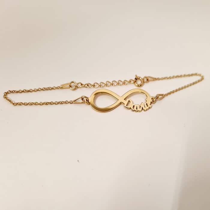 Specification: Bratara personalizata – Infinit cu 1 nume decupat – cu lantisor – Argint 925 placat cu Aur Galben 18K
