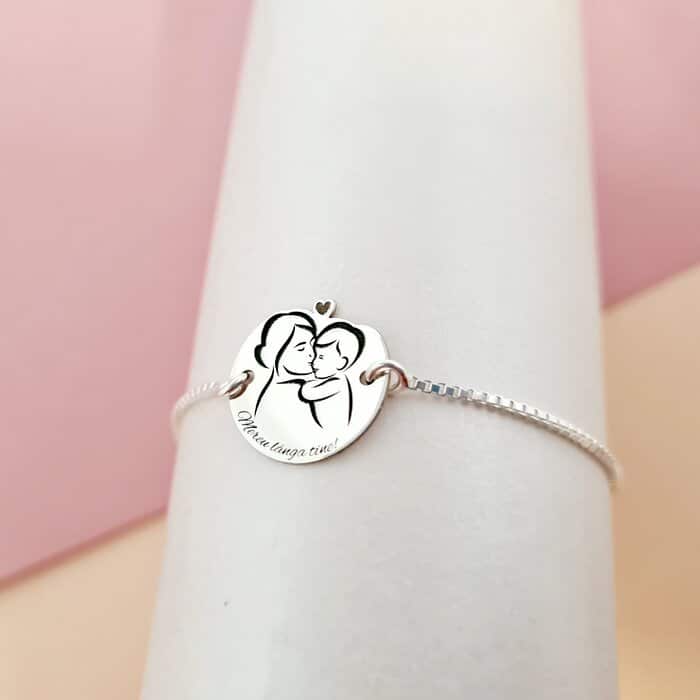 Mereu langa tine este textul personalizat pe bijuterie. Acesta reprezinta exact ceea ce fiecare mama simte fata de pruncul ei. Ca ii va fi mereu aproape sa ii ofere iubire, sprijin si protectie. Pe verso se poate grava orice alt mesaj, nume sau o data, astfel avand o bijuterie personala si cu o semnificatie aparte. Bratara este de tip glisanta si are o marime reglabila putand sa fie fixata pe mana usor, cu ajutorul unei bilute care se deplaseaza pe lungimea acesteia, blocand-o la circumferinta dorita.  DESPRE PRODUS: Bijuteria este creata din Argint 925. Sistemul de inchidere a bratarii este cu biluta glisanta. Banutul are diametrul de 15 mm. Poti alege sa sa personalizezi bratara pe verso cu propriul mesaj. Completeaza casutele de personalizare cu ceea ce iti doresti. Bijuteria va ajunge la tine intr-un saculet elegant din catifea, impreuna cu certificatul de calitate ce atesta autenticitatea materialelor folosite. Gramaj aproximativ ARGINT 925: 2.46 grame Aceasta bijuterie personalizata este realizata de la zero pentru fiecare comanda in parte. Dupa plasarea si confirmarea comenzii incepe procesul ei de creatie:  Realizare Design -> Taiere/Personalizare -> Finisare manuala -> Polish Final -> Ambalare -> Livrare! Datorita procesului de productie si a personalizarii bijuteriei dupa propria dorinta gramajul final al produsului poate fi diferit. Din acest motiv pe site este afisat gramajul obtinut prin catarirea produsului realizat in pozele de prezentare. Pretul produsului include pe langa costul gramului de Argint 925 si tot procesul de mai sus, necesar pentru realizarea unui produs cu adevarat special pentru tine.   Toate produsele din Argint 925 comercializate de Chic Bijoux sunt marcate cu titlul Argintului· 925 ·  Dupa plasarea comenzii veti fi contactat de o colega din echipa Chic Bijoux pentru toate detaliile necesare personalizarii produsului. Bijuteria va ajunge la tine intr-un saculet elegant din catifea, impreuna cu certificatul de calitate ce atesta autenticitatea materialelor folosite.