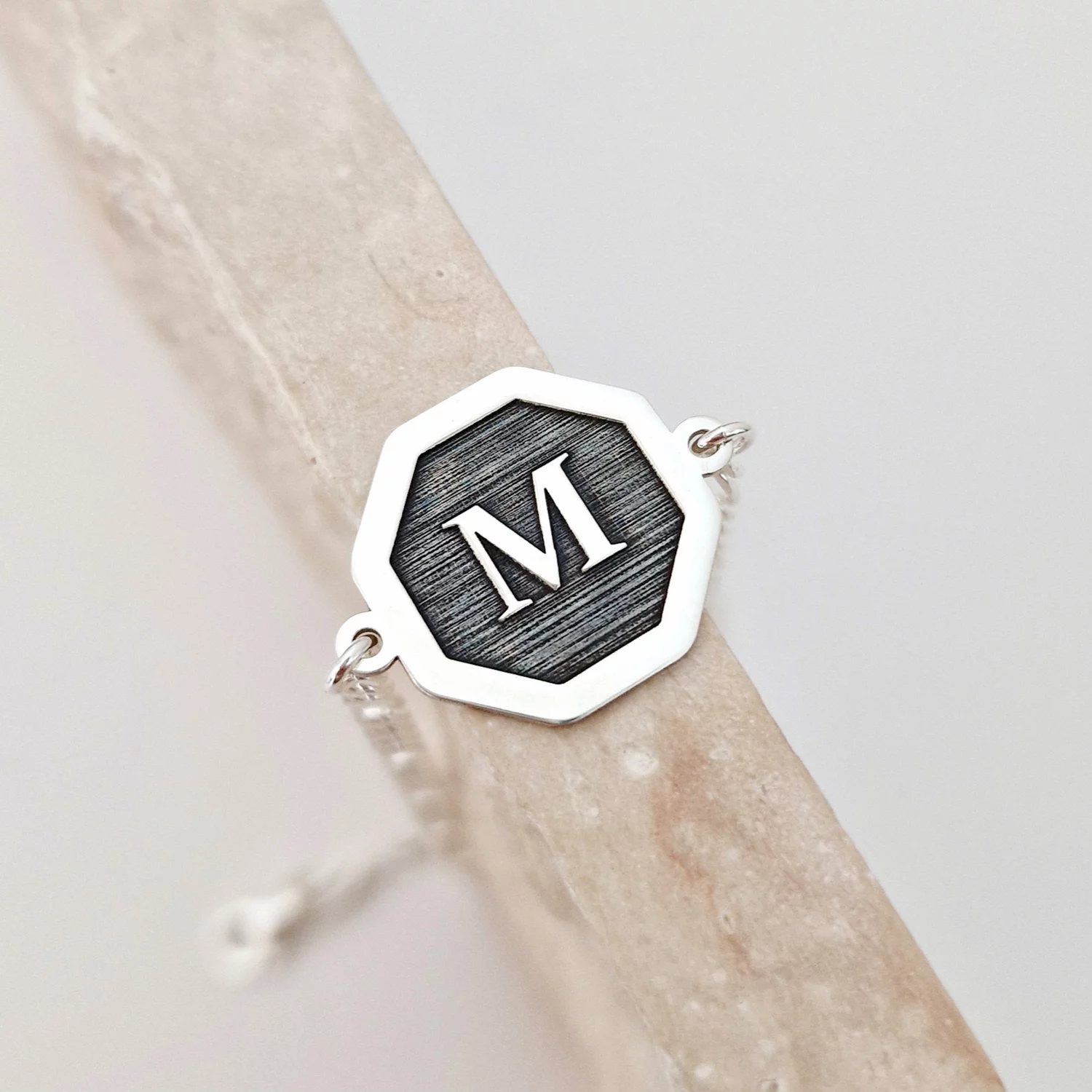 Bratara personalizata – Octagon cu initiala personalizata in relief – Argint 925 – bratara barbati cu lant