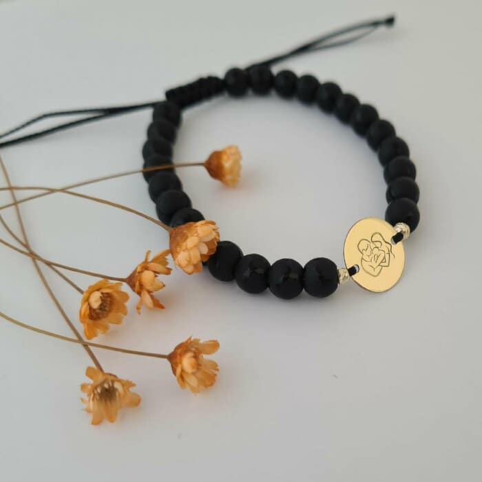 Specification: Bratara personalizata – Proaspeti parinti – Banut 12 mm si 2 bilute din Aur Galben 14K – Pietre semipretioase – Inchizatoare snur reglabil