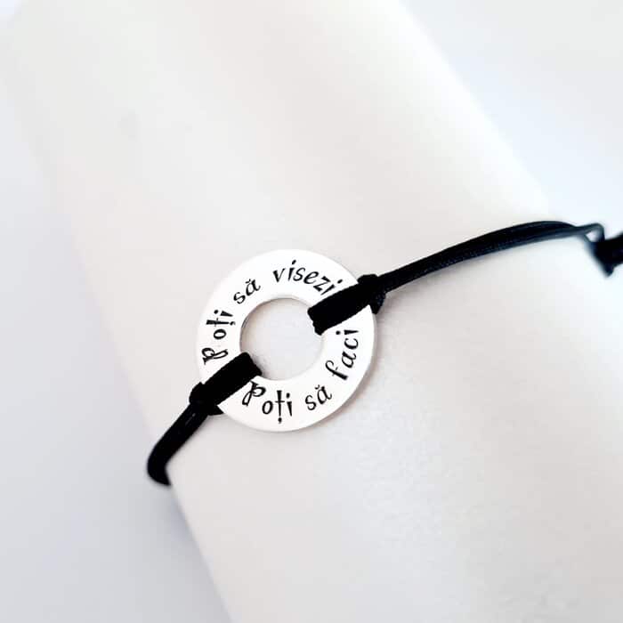 Daca poti sa visezi, atunci poti sa faci! Cu putin noroc si mult curaj telurile tale pot sa prinda contur si viata. Ofera in dar bratara cu mesajul motivational pentru a ii aminti persoanei dragi sa nu se dea batut in a-si realiza visele. Gramaj aproximativ ARGINT 925: 1.48 grame Aceasta bijuterie personalizata este realizata de la zero pentru fiecare comanda in parte. Dupa plasarea si confirmarea comenzii incepe procesul ei de creatie:  Realizare Design -> Taiere/Personalizare -> Finisare manuala -> Polish Final -> Ambalare -> Livrare! Datorita procesului de productie si a personalizarii bijuteriei dupa propria dorinta gramajul final al produsului poate fi diferit. Din acest motiv pe site este afisat gramajul obtinut prin catarirea produsului realizat in pozele de prezentare. Pretul produsului include pe langa costul gramului de Argint 925 si tot procesul de mai sus, necesar pentru realizarea unui produs cu adevarat special pentru tine.   Toate produsele din Argint 925 comercializate de Chic Bijoux sunt marcate cu titlul Argintului· 925 · DESPRE PRODUS: Roata este creata din Argint 925. Diametrul ei este de 18 mm, iar interiorul este de 8 mm. Bratara neagra este creata dintr-un snur gros si rezistent. Marimea este reglabila, fiind potrivita pe orice incheietura. Gravarea unui mesaj propriu este gratuita.  Dupa plasarea comenzii veti fi contactat de o colega din echipa Chic Bijoux pentru toate detaliile necesare personalizarii produsului.