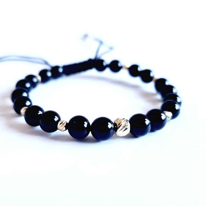 Specification: Bratara pietre semipretioase – Onix 2 cate 2 alaturi de 1 biluta de 5 mm si 10 bilute de 3 mm din Aur 14K – Snur negru rezistent si reglabil
