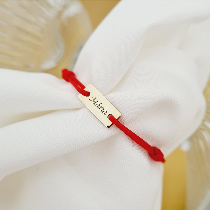 In traditia populara ata rosie este considerata un talisman care te fereste de deochi. De aceea, parintii obisnuiesc sa prinda ata rosie la incheietura mainii bebelusului. Noi am introdus acest concept intr-o bratarica simpatica, special creata pentru cel mic. Gravarea unui nume sau a unei date pe bratara este gratuita! Dupa plasarea comenzii veti fi contactat de o colega din echipa Chic Bijoux pentru toate detaliile necesare personalizarii produsului. Bratara este creata din Aur Galben de 9K prin taiere si gravare laser, avand dimensiunea de 5×12 mm si fiind atasata unui snur de matase vegetala, marime reglabila. Un cadou deosebit! ? Gramaj aproximativ AUR 9K ? (375): 0,18 grame Aceasta bijuterie personalizata este realizata de la zero pentru fiecare comanda in parte.? Dupa plasarea si confirmarea comenzii incepe procesul ei de creatie: Realizare Design -> Taiere/Personalizare -> Finisare manuala -> Polish Final -> Ambalare -> Livrare! Pretul produsului include pe langa costul gramului de Aur 9K si tot procesul de mai sus, necesar pentru realizarea unui produs cu adevarat special pentru tine. ? Toate produsele din Aur Galben 9K comercializate de Chic Bijoux sunt marcate cu titlul Aurului 375.