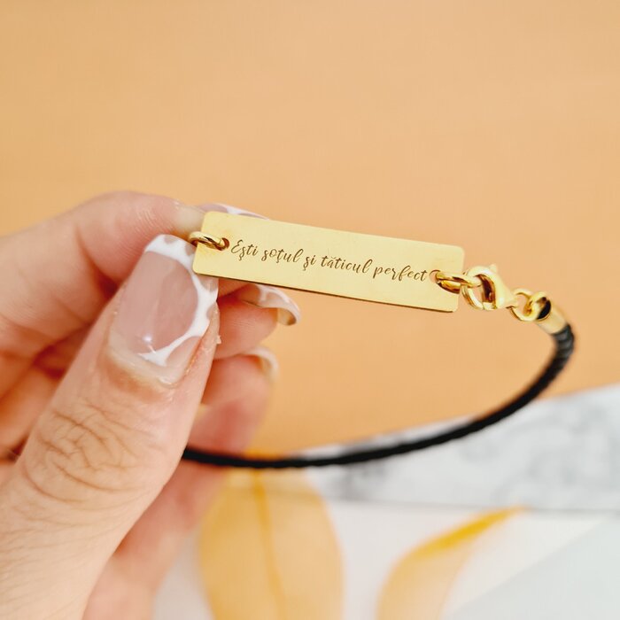 Un barbat obisnuit se poate indragosti, dar unul grozav poate deveni un sot devotat. Un barbat obisnuit poate fi tata, dar unul grozav va fi un tatic iubit. Arata-i sotului si/sau tatalui tau cat de mult inseamna pentru tine printr-o bratara special creata pentru el. ? DESPRE PRODUS: Placuta gravata este din Argint 925 placat cu Aur 14k? Pe ea puteti alege sa gravati un mesaj special. Acesta vine prinsa de o bratara din piele impletita neagra. Sistemul de inchidere a bratarii este cu inchizatoare tip carabina. Daca nu stii care e marimea ta sau a persoanei careia doresti sa ii faci cadou bratara, articolul? Cum sa masori dimensiunea incheieturii? ?de pe blogul Chic Bijoux iti vine in ajutor. ? Gramaj aproximativ ARGINT 925: 2 grame Aceasta bijuterie personalizata este realizata de la zero pentru fiecare comanda in parte.? Dupa plasarea si confirmarea comenzii incepe procesul ei de creatie: Realizare Design -> Taiere/Personalizare -> Finisare manuala -> Polish Final -> Ambalare -> Livrare! Datorita procesului de productie si a personalizarii bijuteriei dupa propria dorinta gramajul final al produsului poate fi diferit. Din acest motiv pe site este afisat gramajul obtinut prin catarirea produsului realizat in pozele de prezentare. Pretul produsului include pe langa costul gramului de Argint 925 si tot procesul de mai sus, necesar pentru realizarea unui produs cu adevarat special pentru tine. ? Toate produsele din Argint 925 comercializate de Chic Bijoux sunt marcate cu titlul Argintului? 925 ? ? RECOMANDARI: Nu scufundati bratara in lichide sau substante de curatare: pielea se poate decolora sau decoji, iar bijuteriile placate se deterioriaza si isi pot chiar schimba culoarea. Contactul zilnic cu apa (bai)?sau cu produse chimice (spray-uri, detergenti, inalbitor, clor, diluanti etc.) pot de asemena sa afecteze bijuteria, existand riscul de a se desface si/sau de a se decolora. Pentru ca bratara sa vi se potriveasca te rugam sa ne transmiti marimea. ? Dupa plasarea comenzii va va contacta o colega din echipa Chic Bijoux pentru toate detaliile necesare personalizarii produsului.
