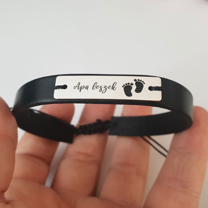 Cadoul perfect pentru un viitor tatic mandru. Apa leszek – Viitor tatic – Future dad sau orice mesaj iti doresti poate fi gravat pe placuta din Argint 925 alaturi de simpaticile picioruse decupate. ? DESPRE PRODUS: Placuta gravata este din Argint 925 si vine atasata pe o bratara din piele neagra sau maro. Pe acesta puteti alege sa gravati un mesaj special. Bratara este reglabila prin intermediul unui snur din matase vegetala prins la capetele bandei de piele. Dimensiunea minima standard este de 20 cm, insa aceasta poate fi modificata la cerere -> Spune-ne in casuta Marime bratara care este circumferinta incheieturii. Bratara din piele are latimea de 10 mm. Poti alege intre culoarea neagra sau maro. Spune-ne in casuta de comentarii ce culoare doresti. Gramaj aproximativ ARGINT 925: 1.55 grame Aceasta bijuterie personalizata este realizata de la zero pentru fiecare comanda in parte.? Dupa plasarea si confirmarea comenzii incepe procesul ei de creatie: ? Realizare Design -> Taiere/Personalizare -> Finisare manuala -> Polish Final -> Ambalare -> Livrare! Datorita procesului de productie si a personalizarii bijuteriei dupa propria dorinta gramajul final al produsului poate fi diferit. Din acest motiv pe site este afisat gramajul obtinut prin catarirea produsului realizat in pozele de prezentare. Pretul produsului include pe langa costul gramului de Argint 925 si tot procesul de mai sus, necesar pentru realizarea unui produs cu adevarat special pentru tine. ? ? Toate produsele din Argint 925 comercializate de Chic Bijoux sunt marcate cu titlul Argintului? 925 ? RECOMANDARI: Pentru ca bratara sa vi se potriveasca te rugam sa ne transmiti marimea in casuta. Nu scufundati bratara in lichide sau substante de curatare: pielea se poate decolora sau decoji, iar bijuteriile placate se deterioriaza si isi pot chiar schimba culoarea. Contactul zilnic cu apa (bai) sau cu produse chimice (spray-uri, detergenti, inalbitor, clor, diluanti etc.) pot de asemena sa afecteze bijuteria, existand riscul de a se desface si/sau de a se decolora. ? Dupa plasarea comenzii va va contacta o colega din echipa Chic Bijoux pentru toate detaliile necesare personalizarii produsului.