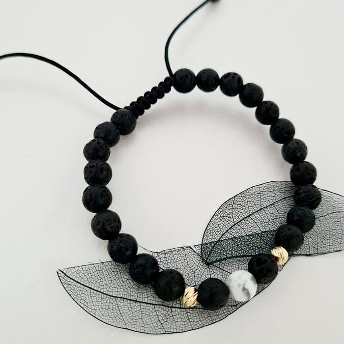 Bratara Renastere – Pietre Lava si Agat alb – Bilute din Aur 14K – Snur negru rezistent si reglabil