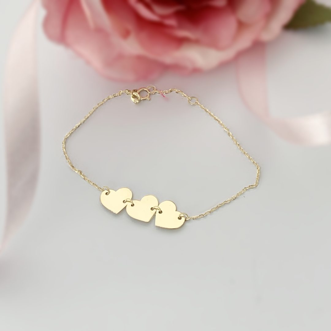 Specification: Bratara trei inimioare aur galben alb sau roz 14K cu lant dama