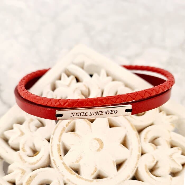 Specification: Bratara unisex cu 2 straturi de piele naturala rosie – Placuta cu gravura personalizata – Argint 925 – Inchizatoare clips inox