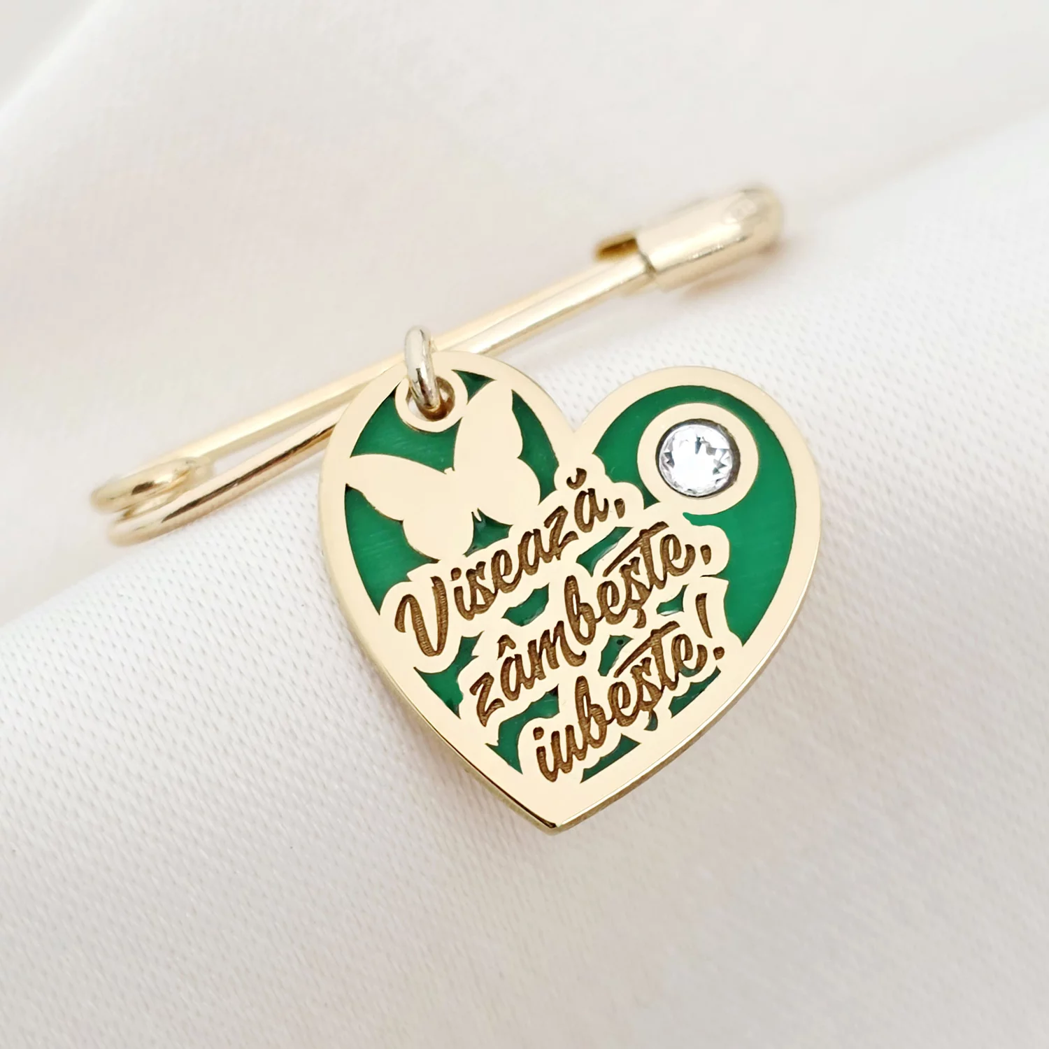 Specification: Brosa Ac de siguranta – Inima cu Zambete ? Text personalizat – Argint 925 placat cu Aur Galben 18K – Email verde & Cristal Swarovski