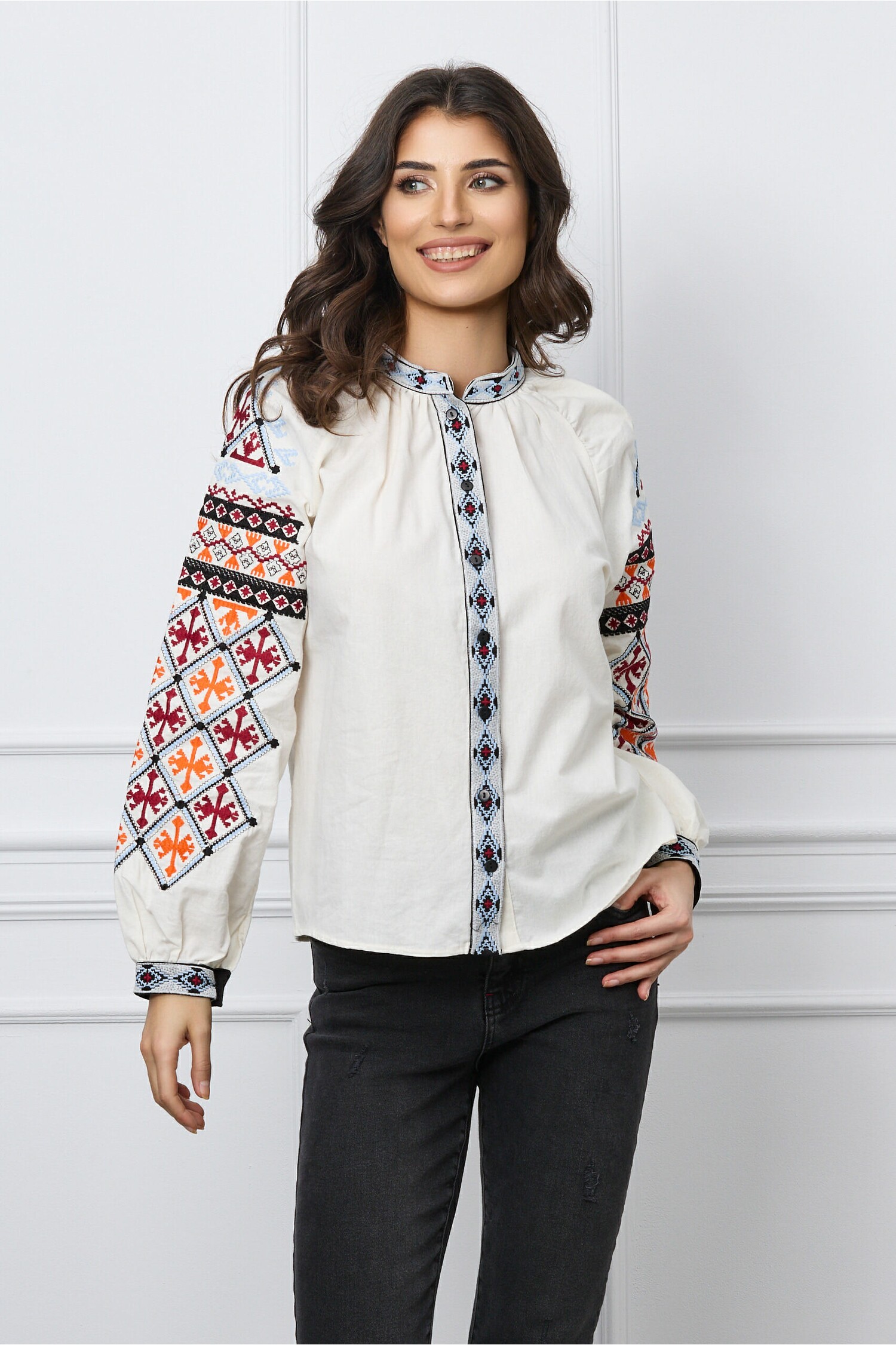 Specification: Camasa casual cu broderie traditionala bleu si orange