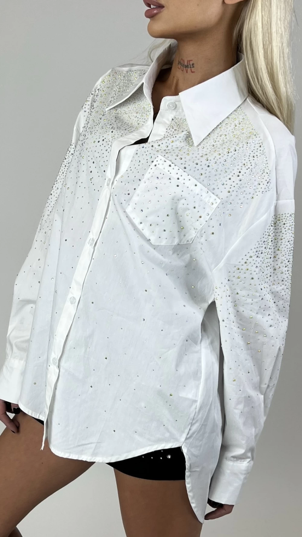 Specification: Camasa dama alba asimetrica cu strasuri