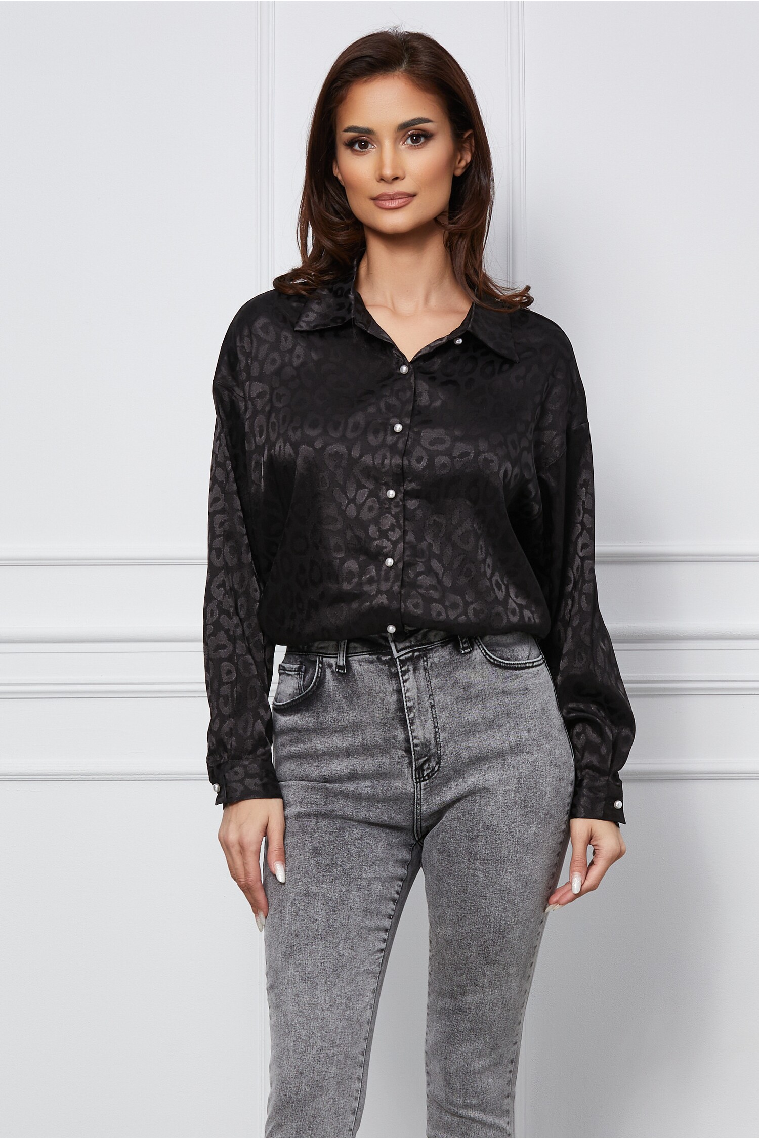 Camasa Dorina neagra cu animal print satinat! La acest produs ai transport si retur GRATUITE!